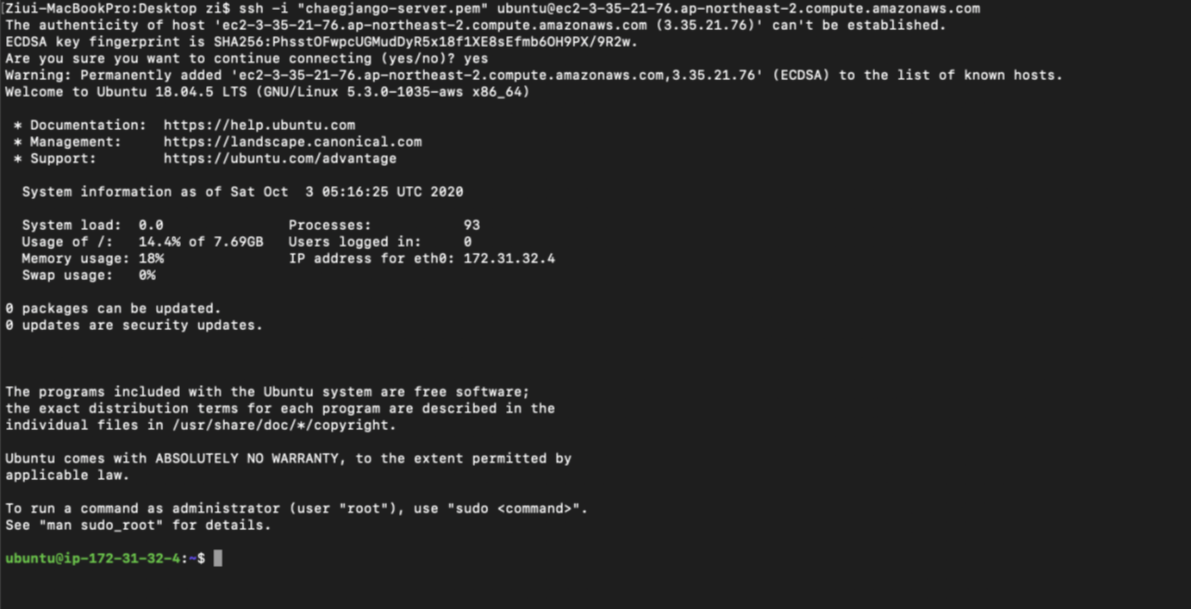 - $ ssh -i "example.pem" ubuntu@ec2-3-35-21-76.ap-northeast-2.compute.amazonaws.com(생성된 인스턴스 주소)