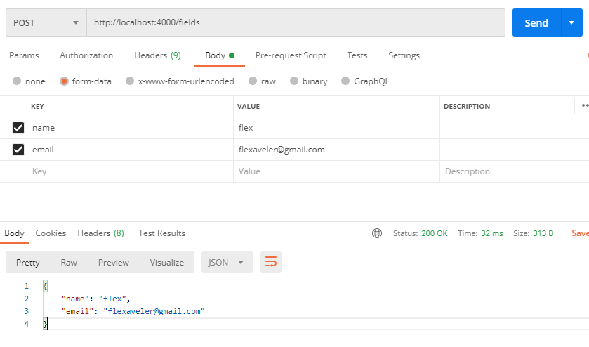 여러가지 값을 받을 떄는 fileds 위치에 배열 안에 각 엘리먼트를 객체 형태로 설정해주면 된다. 각 엘리먼트에는 name이라는 key를 지정해주고 value로 formData.append 했던 key를 넣어주면 된다.